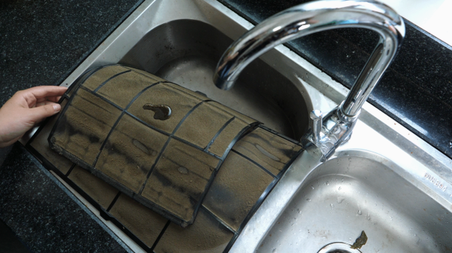 步骤4、可以看到内部有塑料材质的2个框,左右各一个。这个框内是纤维网,这个就是过滤空调空气,最藏污垢的部位了。当然也很多的灰尘在上面。